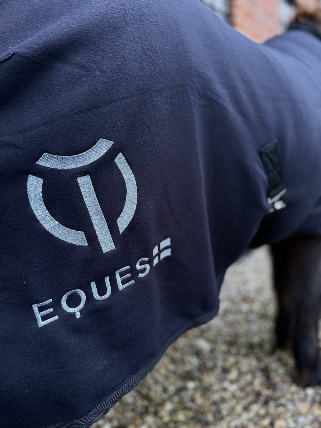 Dækkenet er udført i klassisk sort fleece og fuldendes af en elegant mørkegrå broderet EQUES-symboldetalje, som understreger det eksklusive og tidløse design.