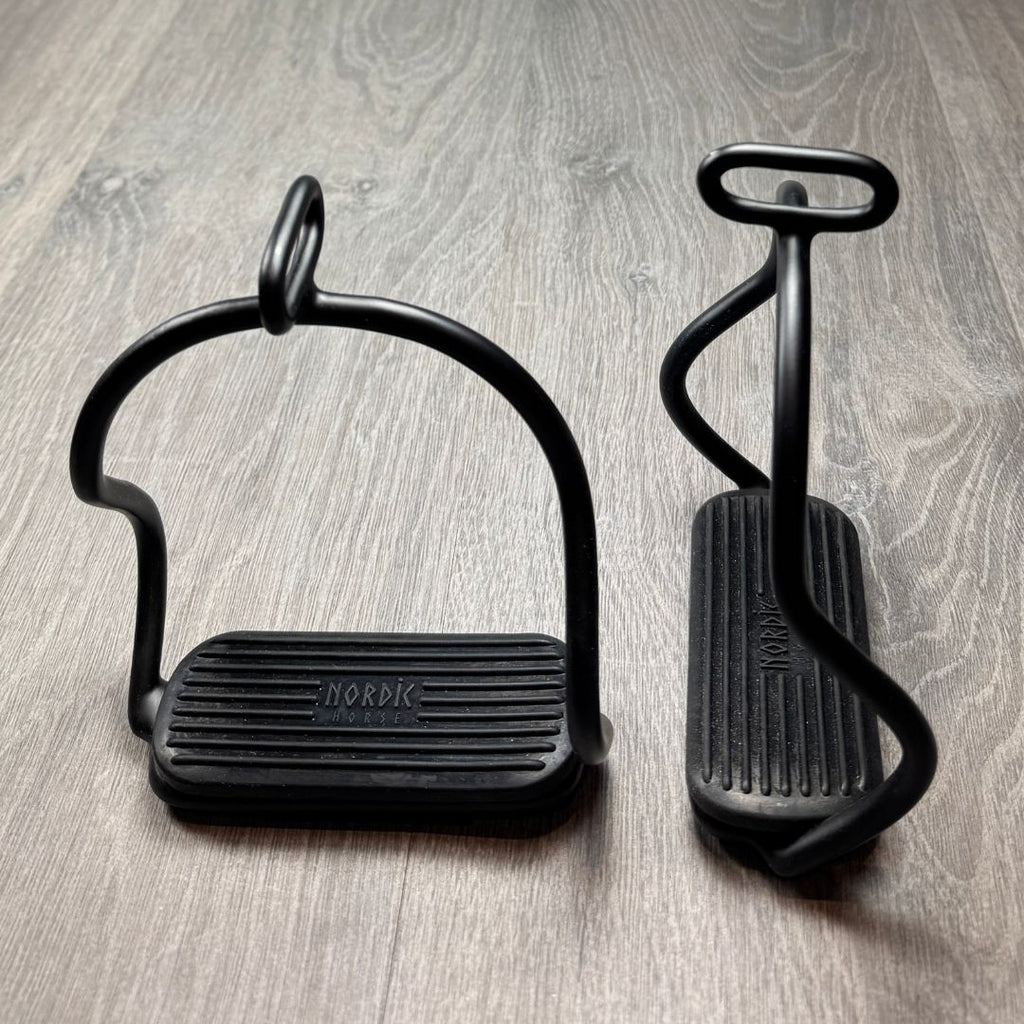 Stigbøjle med dobbelt S form der bidrager til ekstra sikkerhed. Det drejede øje gør det nemmere at fange bøjlen under ridning. Bøjlen er i stål med mat sort pulverlakering og sort gummiplade der har riller og et diskret præget logo for øget antiskrid effekt. Indvendig bredde er 11,5 cm. Den samlede vægt på 690 gram bidrager til stabilitet.